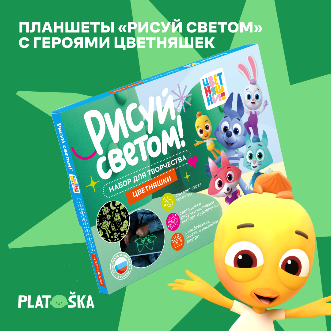 Студия анимации Platoshka с радостью представляет набор для творчества «Рисуй светом», вдохновленный популярным мультсериалом Цветняшки. Набор позволит юным зрителям изобразить своих любимых персонажей в светящихся картинках. В комплекте есть всё необходимое: планшет формата А4, ручка-фонарик для создания световых рисунков, трафарет с героями Цветняшек, набор наклеек с персонажами и даже открытка с QR-кодами для перехода к любимым песенкам из мультсериала.