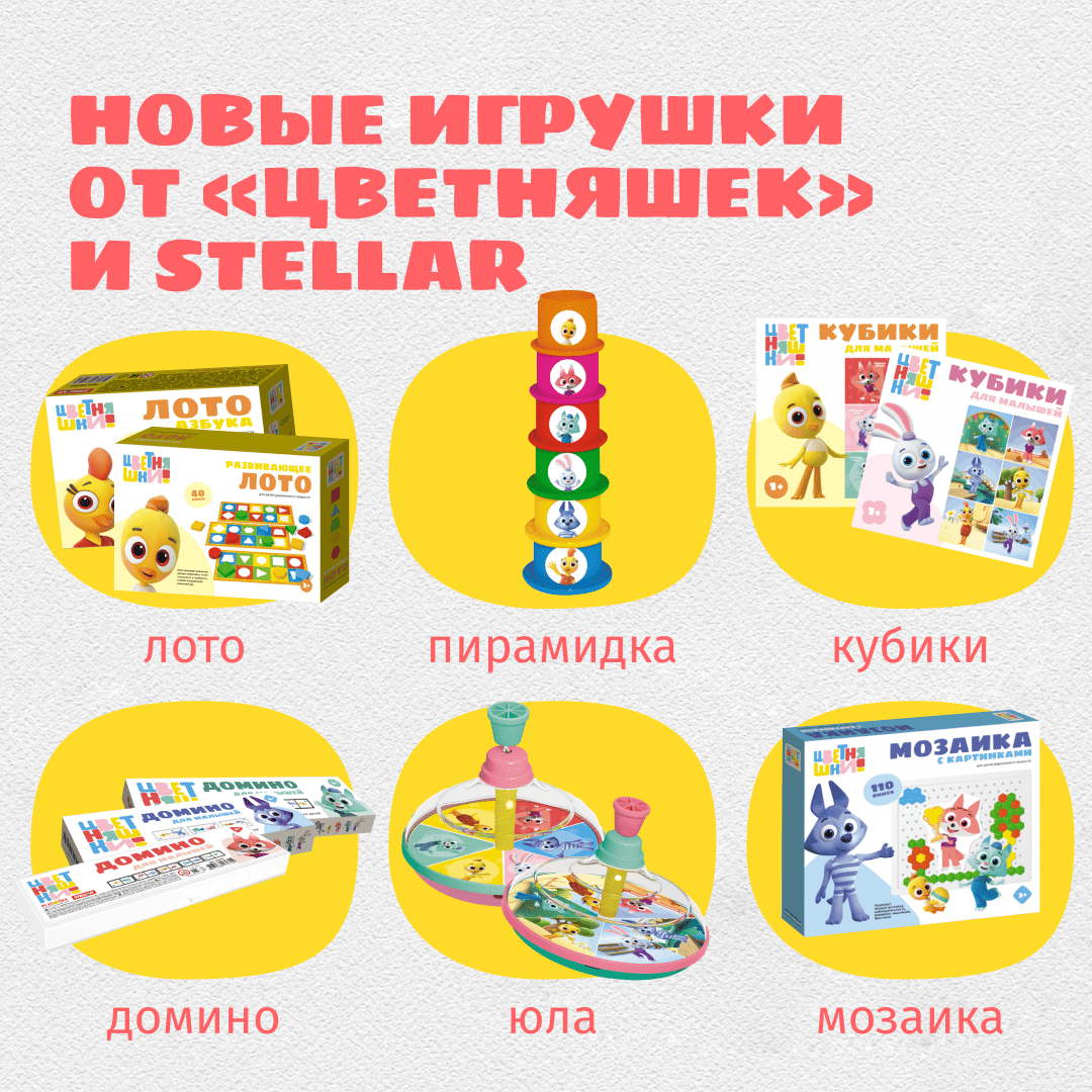 Новые позиции в товарном ряду “Цветняшек” уже доступны к покупке на маркетплейсах! Теперь порадовать своего ребенка можно развивающими игрушками от комбината Stellar. Вместе с производителем “Цветняшки” выпустили лото и домино с любимыми героями, мозаику, кубики и пирамидки. Яркие игрушки не только радуют глаз, но и развивают малыша согласно возрасту при помощи знакомых образов героев мультфильма – Волчонка У, Лисёнка Айяяй, Зайчонка Скок, Цыпленка Пи и Котенка Мур. Для более эффективного использования кубиков рекомендуется предлагать малышу разные тематические наборы.