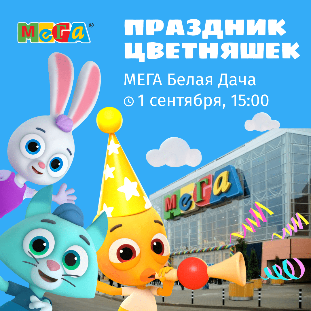 Герои “Цветняшек” Котенок Мур, Зайчонок Скок и Цыпленок Пи примут участие в семейном празднике, организованном торговым центром Мега Белая Дача под названием «Моя мама — супергерой!» . На сцене развернется настоящее шоу: конкурсы, анимация, музыка и даже гигантская раскраска! Пообщаться с любимыми героями можно будет с 15:00 до 16:00. Вход свободный.