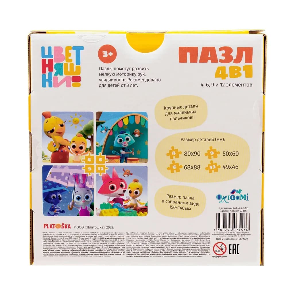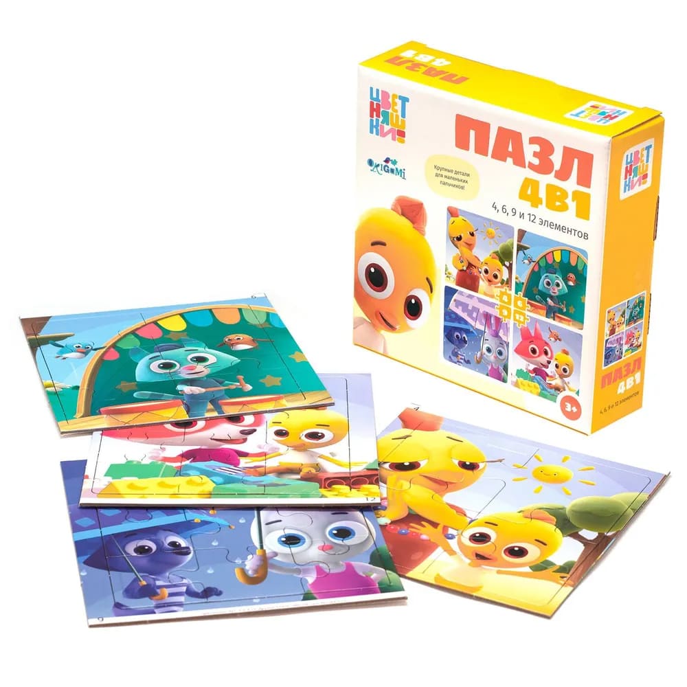 Производитель ОригамиНабор макси пазлов 4в1 «Цветняшки» - комплект головоломок с 4, 6, 9 и 12 элементами, развивающий внимание и моторику. Яркие картинки с героями мультсериала, материалы: экологичный картон и бумага. Подходит для детей от 1 года.