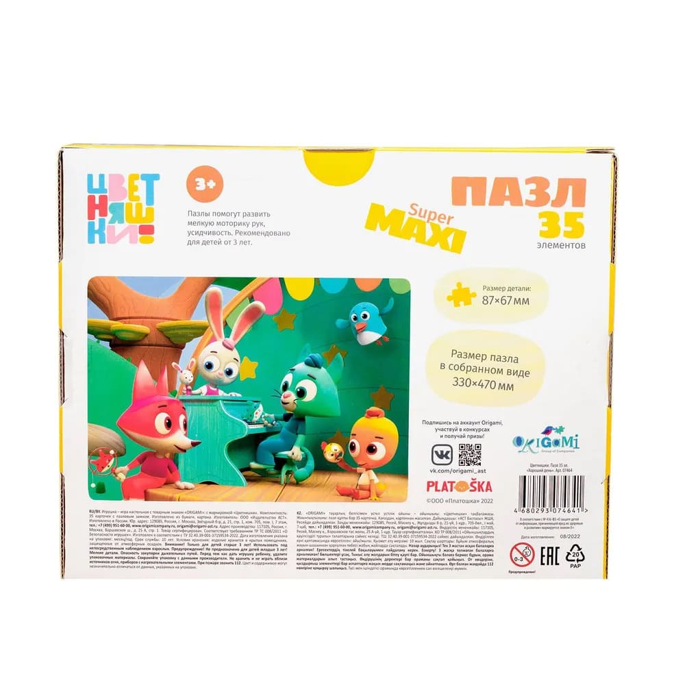 Производитель ОригамиБольшой пазл с 35 элементами из серии «Цветняшки» - игра для малышей, развивающая моторику, внимание и логическое мышление. Крупные детали идеально подходят для маленьких ручек, а яркие картинки стимулируют визуальное восприятие и концентрацию. Размер пазла: 330х470 мм, деталь: 87х67 мм. Материалы: картон, бумага. Подходит для детей от 1 года.