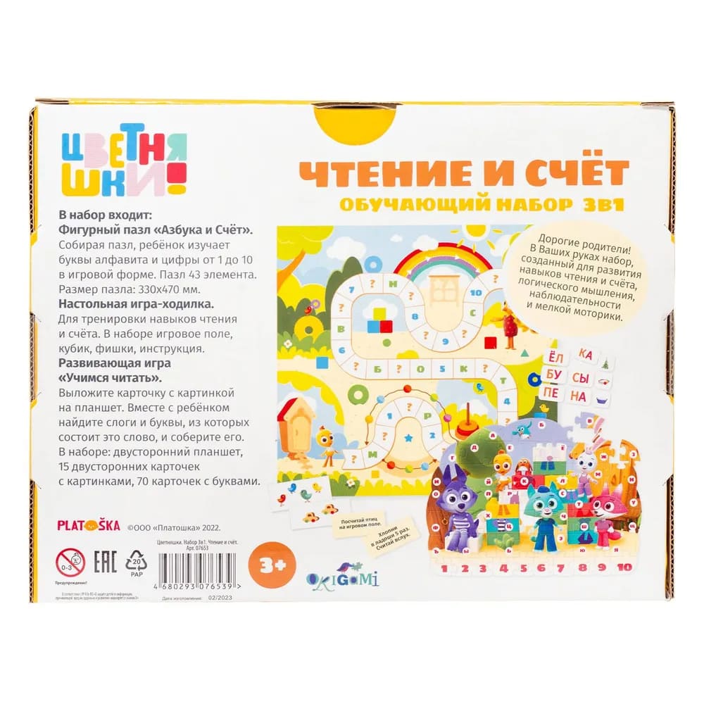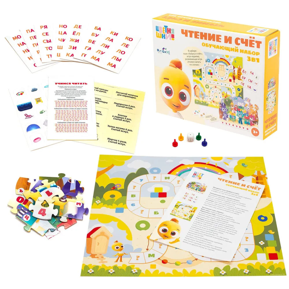 Производитель ОригамиПазл «Азбука и счет» из мультсериала «Цветняшки» - игра из 43 элементов, которая помогает ребенку изучать алфавит и счет до 10. В комплекте также механика 'Учимся читать по слогам', где ребенок может составлять простые слова, а уникальные иллюстрации помогут ему в этом. В наборе: пазл (43 элемента), 15 карточек с картинками, 70 карточек со слогами, планшет. Материалы: картон, бумага, полимерные материалы. Для детей от 3 лет.