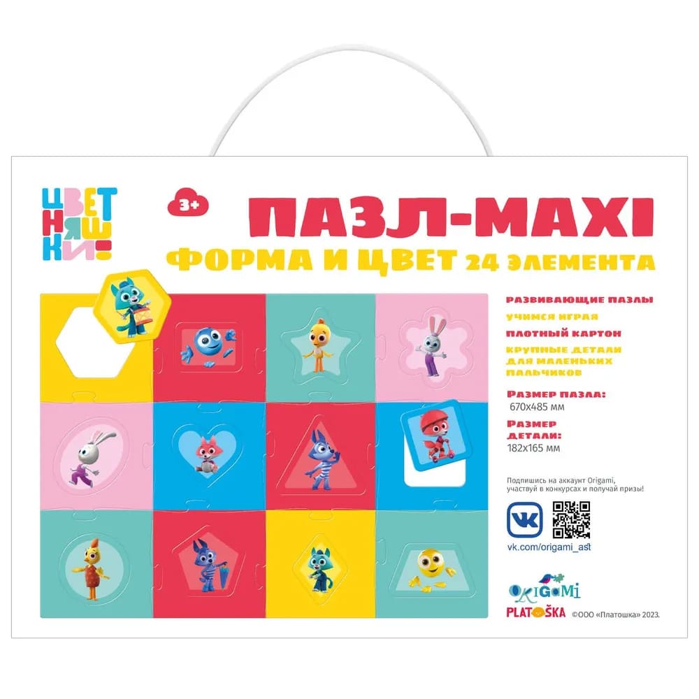 Производитель ОригамиБольшой напольный пазл «Форма и цвет» - это отличный первый пазл для вашего малыша, с помощью которого ребенок освоит названия цветов и геометрические формы, а яркие изображения животных сделают игру увлекательной. Крупные элементы удобны для маленьких ручек, а плотный картон исключает заломы. Размер: 24 детали. Материалы: картон, бумага. Для детей от 1 года.