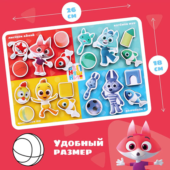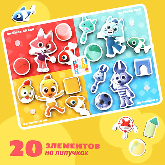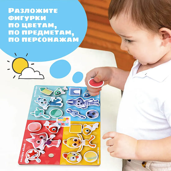 Производитель MapachaРазвивающие вкладыши «Цветняшки: сортируем предметы» - это игра, которая помогает развивать координацию движений, мелкую моторику и память малыша. В комплект входят игровое поле и 20 фигурок на липучках. Ребенок будет сортировать предметы по цветам, типам и персонажам. Размер игрового поля: 26x18x0,4 см. Изготовлено из древесных материалов. Рекомендованный возраст: 3+.