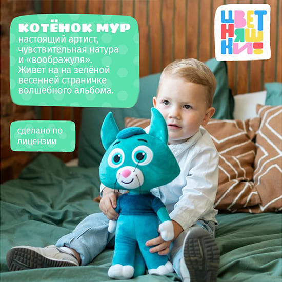 Производитель Смол ТойсМягкая игрушка «Котёнок Мур» - это персонаж мультсериала «Цветняшки», предназначенный для развития музыкальных и слуховых навыков у детей. Изготовлена из высококачественного полиэстера, она приятна на ощупь и безопасна для малышей. Игрушка помогает развивать моторику и когнитивные навыки, а также используется для игр и сна.