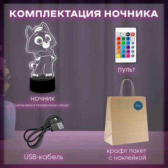 Производитель РМА БАШНЯ ТЕСЛЫНочник «Волчонок У» - это ночник с персонажем из мультсериала 'Цветняшки', который дает 12 цветов свечения и несколько режимов переключения. Управление осуществляется сенсорной кнопкой или пультом (в комплекте). Питание от 3 батареек АА или через USB. Размер: 22,5х13,2х8 см. Ночник идеально подойдет для подарка на Новый год, Рождество или день рождения.