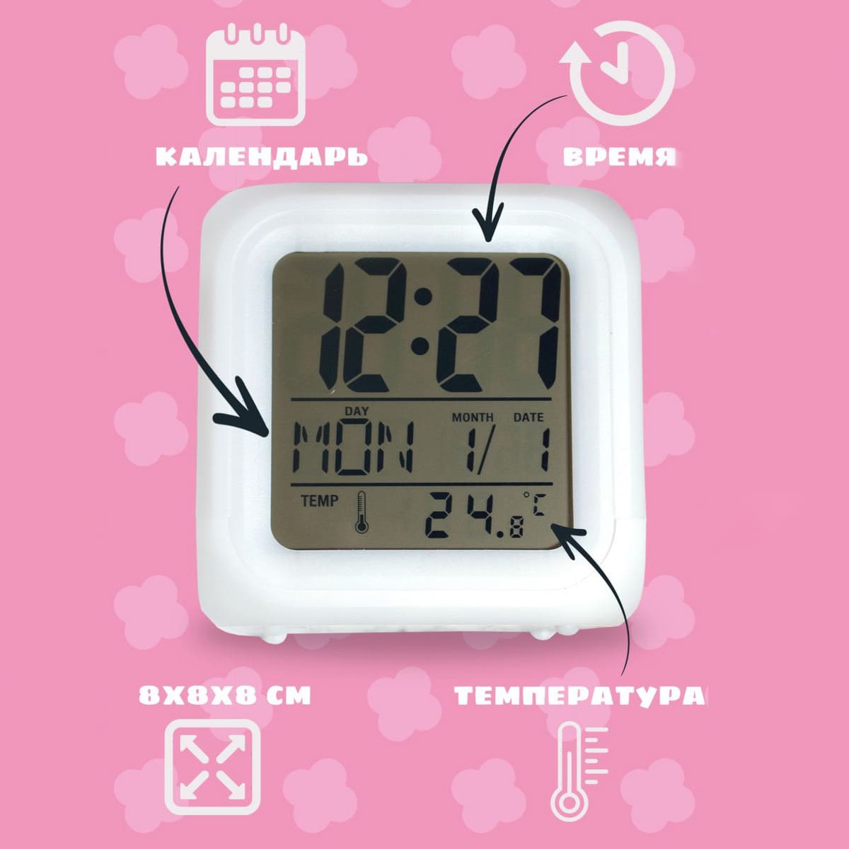 Производитель РМА БАШНЯ ТЕСЛЫСветодиодные настольные часы «Зайчонок Скок» - это оригинальный будильник в виде куба с изображением персонажа из мультсериала «Цветняшки». Часы имеют 7 мягких цветов подсветки, меняющихся каждые 5 секунд, и показывают время, дату, температуру и имеют функцию будильника. Размер: 8х8х8 см. Работает от 3 батареек типа ААА (в комплект не входят). Отличный подарок для детей и взрослых.